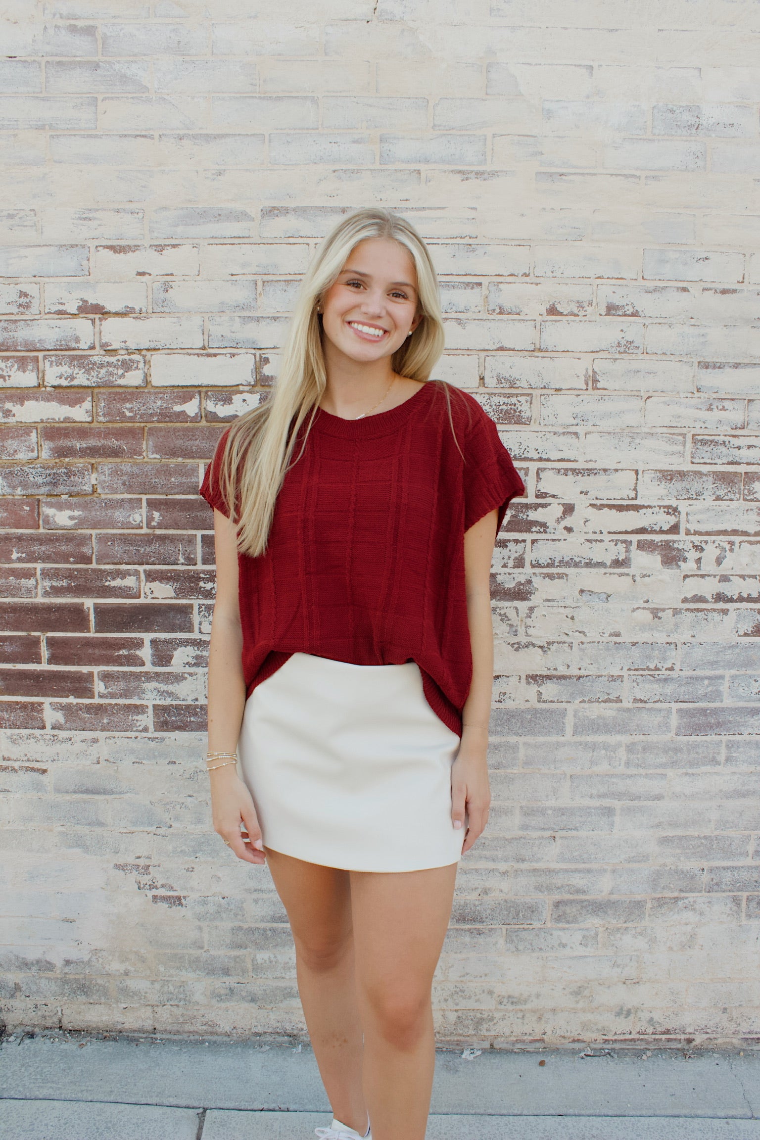 This sweater vest has a sweet plaid detail and would be perfect layered with a turtle neck this fall!