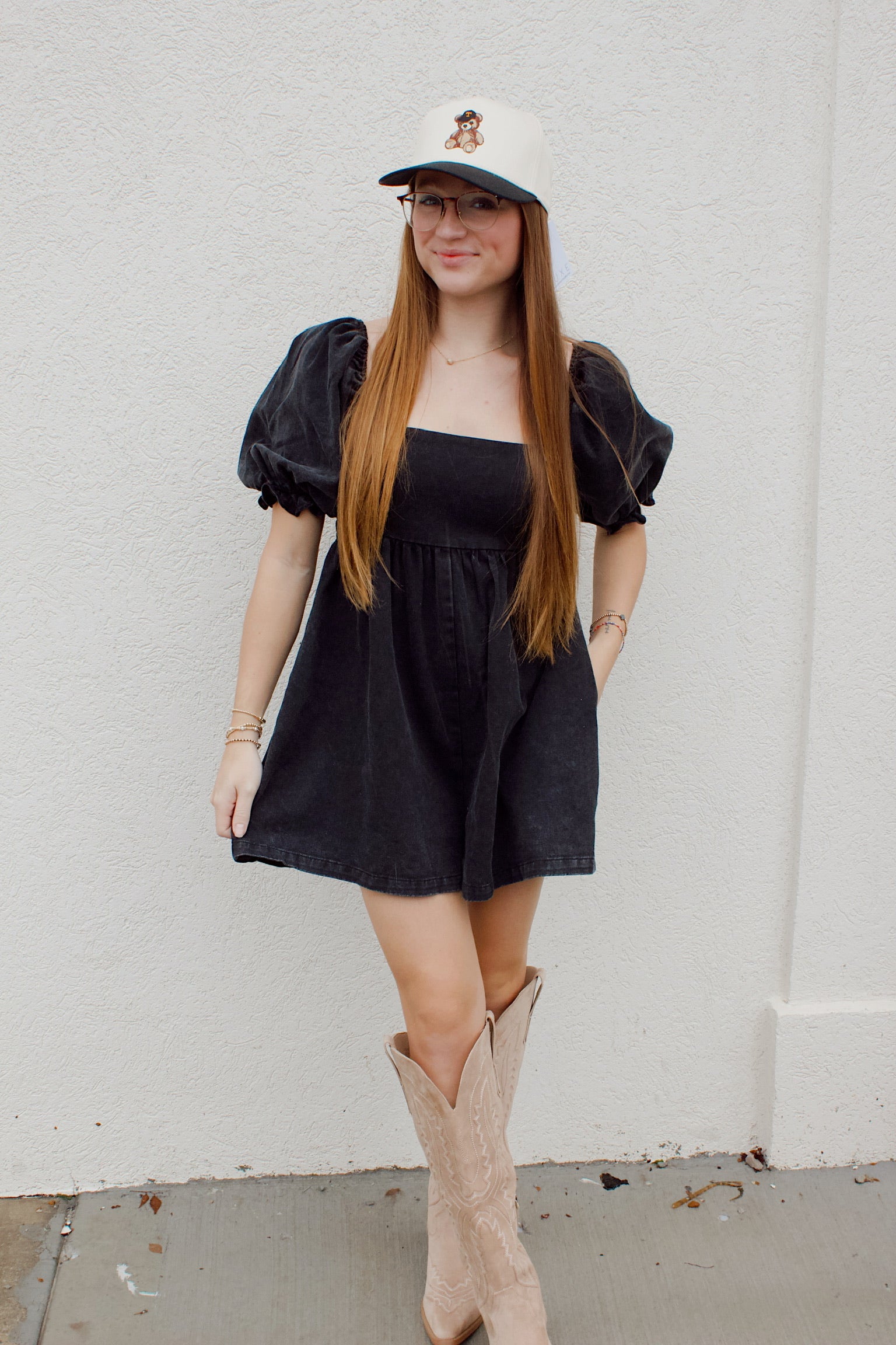 This short black denim romper comes with the cutest bubble sleeves and full coverage on the bottom! You can layer with leggings or a mesh undershirt for the chilly days!