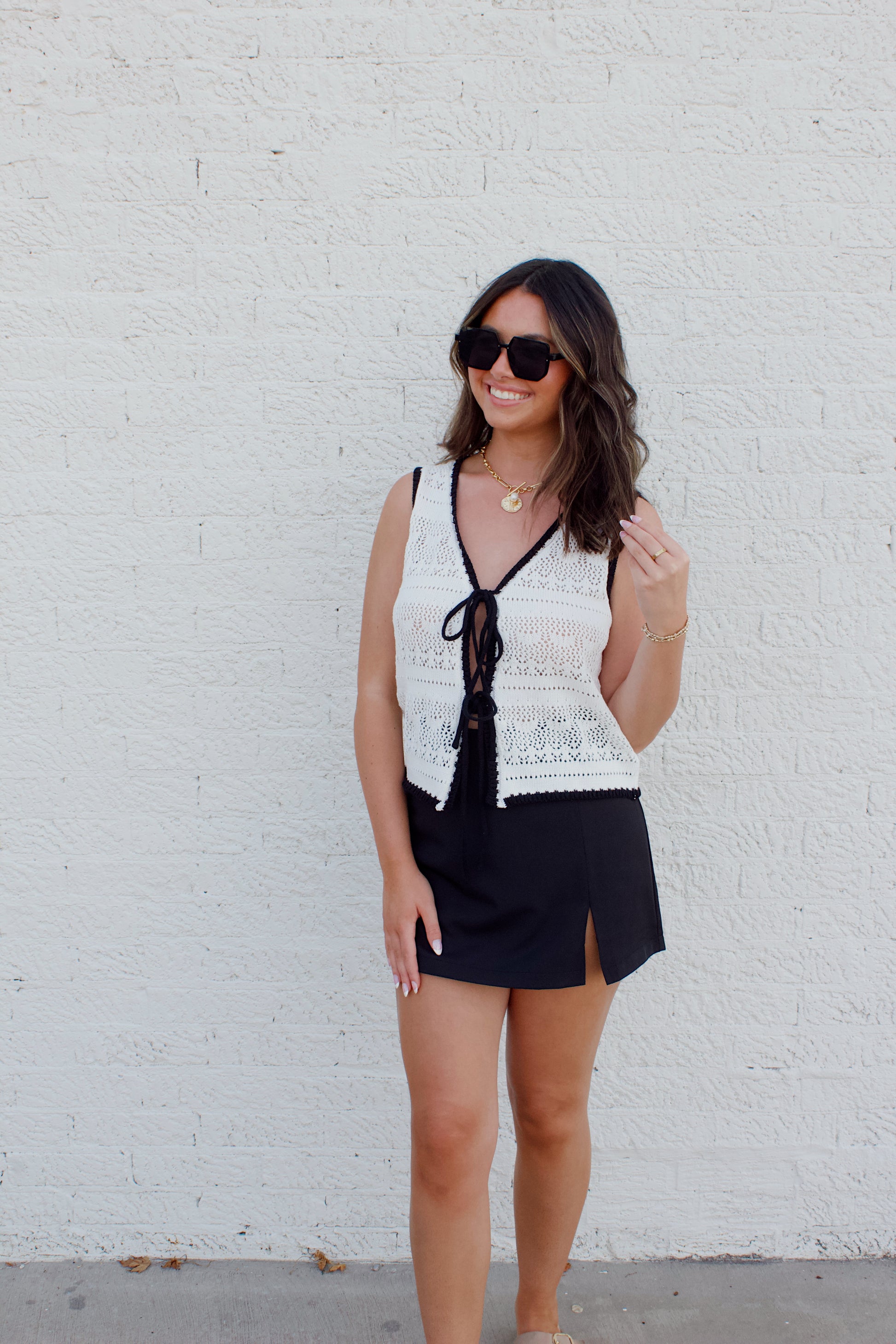 White knit sweater vest with black to accent the sides and bows that tie it the front, perfect for layering this fall!