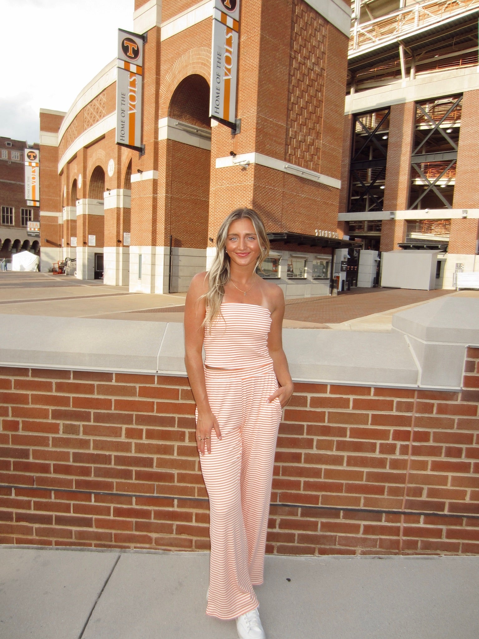 This tube top and pants set is perfect for class, running errands, or comfy gameday. These pieces are sold as a set and will make the perfect addition to your closet!