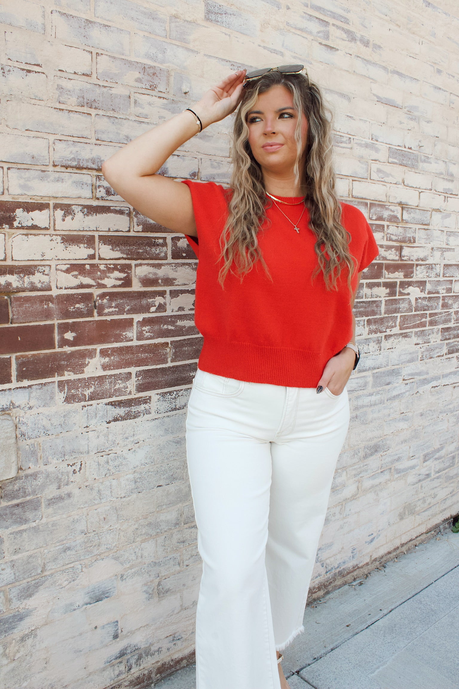 This simple red sweater vest is a great staple piece to add to your closet because it is a great color to wear all year round! It can be layered with a simple undershirt or a cute denim jacket!