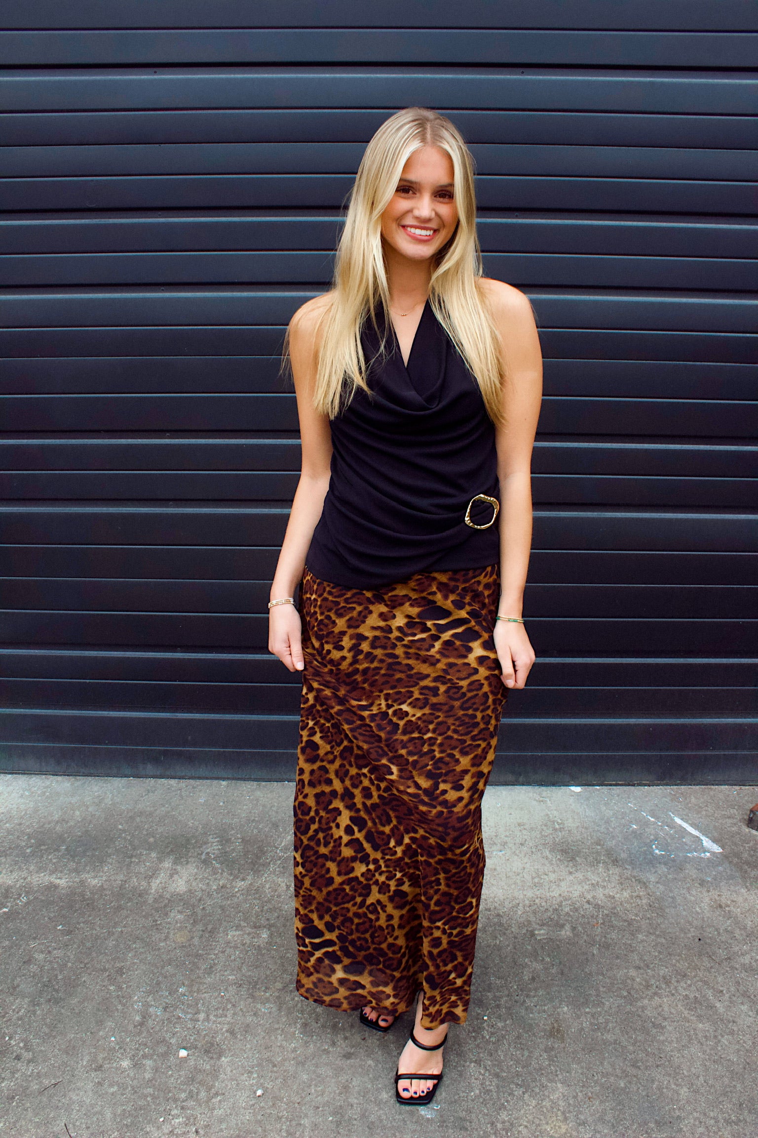 A halter top is a go to for a dinner party or a night out! We are loving the gold detail on this top!