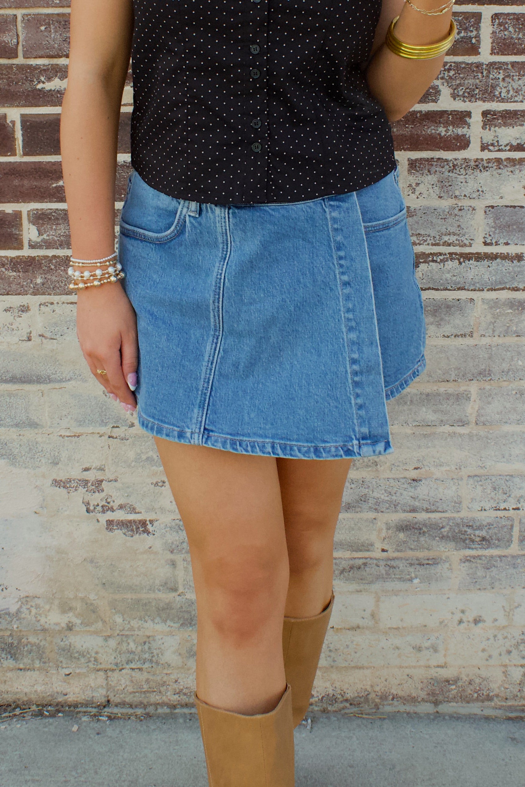 This denim wrap skort is adorable! We are loving the front pocket and the extra detail!